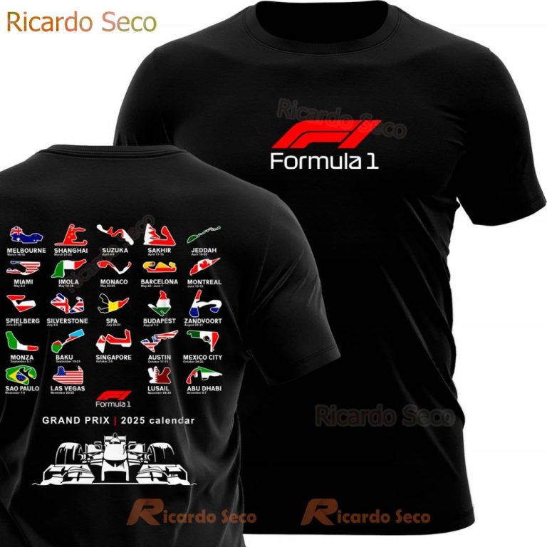Keywords: Formula 1, F1, Grand Prix, 2025 Calendar, Racing, Motorsport, Drivers, Teams, Circuits, T-Shirt, Ricardo Seco, Apparel, Fashion, Unique Design, Premium Cotton, High-Quality Printing