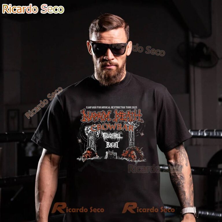 Keywords: Napalm Death, Grindcore, Metal, Heavy Metal, Music, Concert, Festival, Band Merch, Tour T-Shirt, 2025 Tour, Premium Cotton, Graphic Tee, Ricardo Seco
